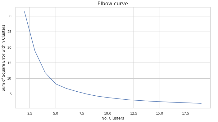 How many clusters do we actually need? Rather than make some arbitrary decision we can use an Elbow Curve, often used to truncate the number of parameters in data-driven models. This method shows us the relationship between the number of clusters and the Sum of Squared Errors (SSE) resulting from using that number of clusters.