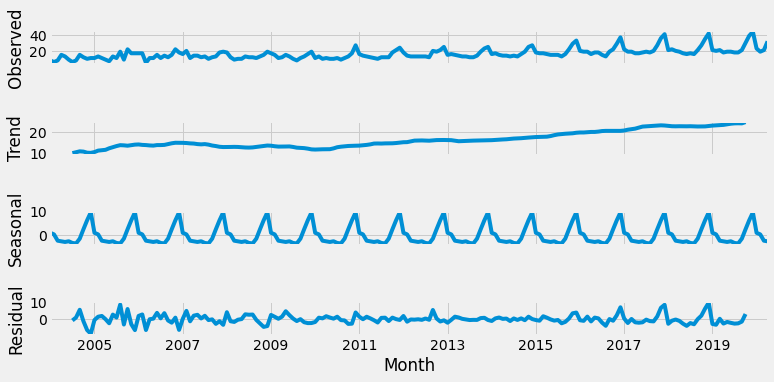 And if we want decompose the time-series, this library plot a nice graph with Trend, Seasonal and Residuals components of the serie.