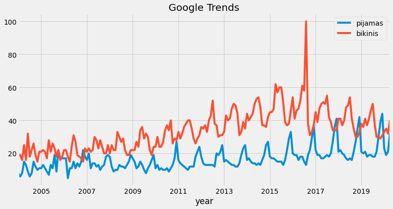As an example, we will use “pajamas” and “bikinis” worldwide Google searches. You can get this data directly from Google Trends.