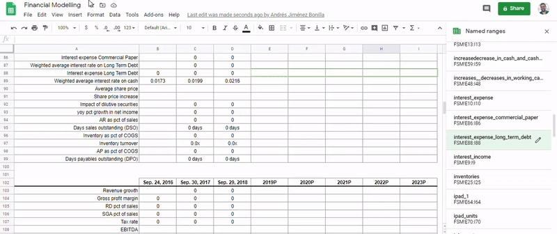 - There are unique variables (named ranges): Calculation in cells shows the name of the variables, so it’s really easy to follow the financial modelling
